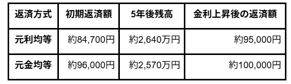 ・月々の返済額は元利均等の方が少ない為、月々のキャッシュフローが出しやすいですが、残債の減りが遅いこと、金利上昇の際に影響を受けやすいなどのデメリットも多いです。